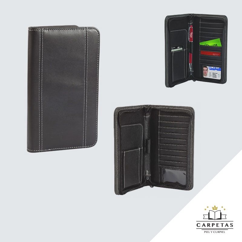 Carpeta fabricada en Curpiel, con cierre para mantener seguros sus documentos, funciona como pequeña cartera, tiene compartimientos para la identificación, tarjetas de crédito, compartimientos para papeles, tiene espacio y sujetador para bolígrafo.