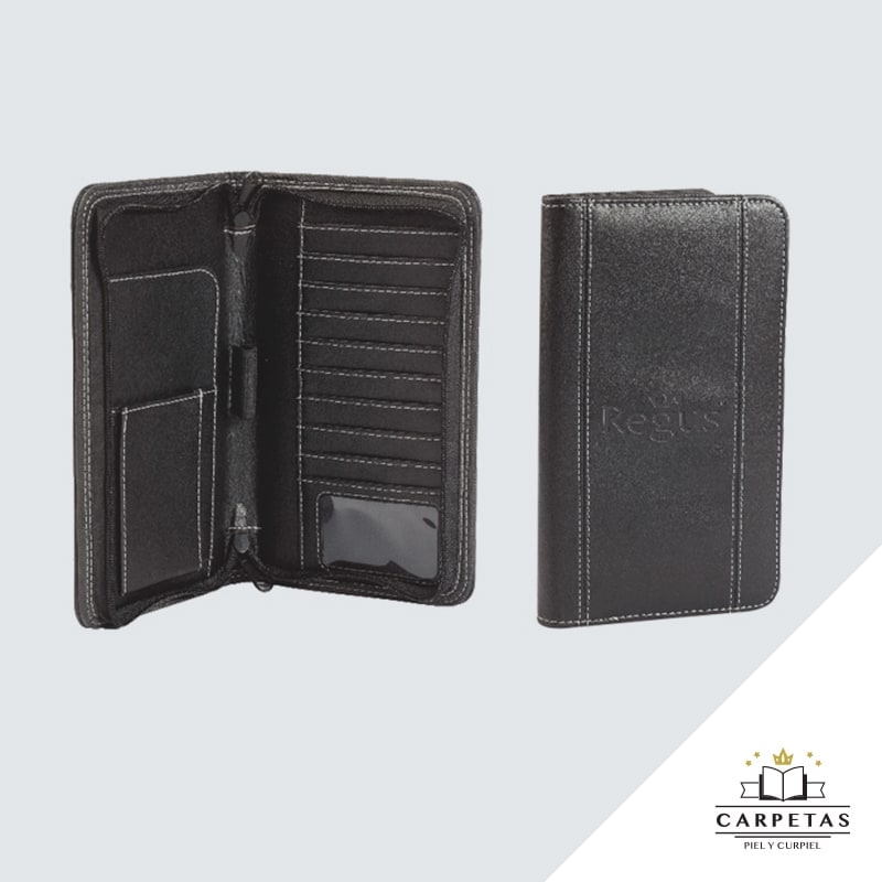 Carpeta de curpiel con cierre, divisiones para tarjeta, compartimentos para papeles y credenciales y portapluma. Túnez Colores: Negro.